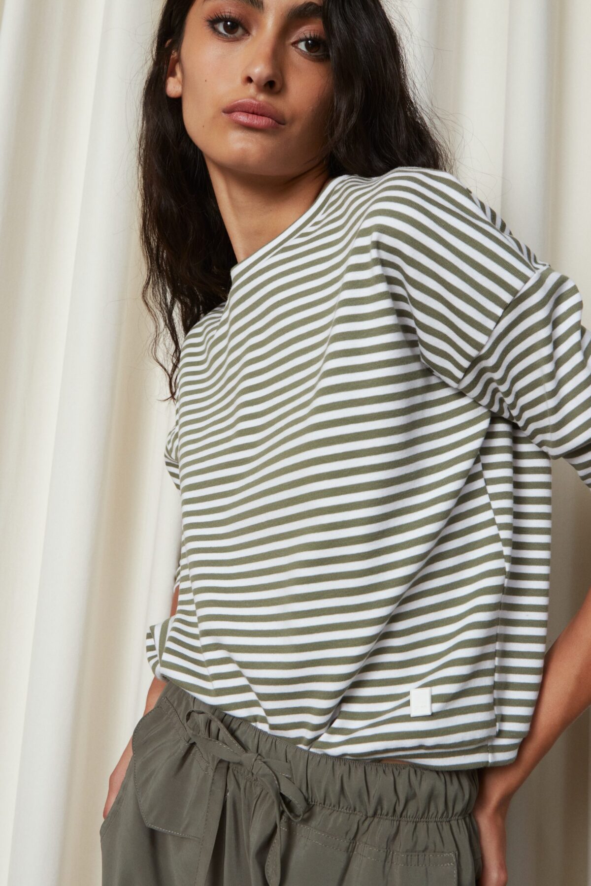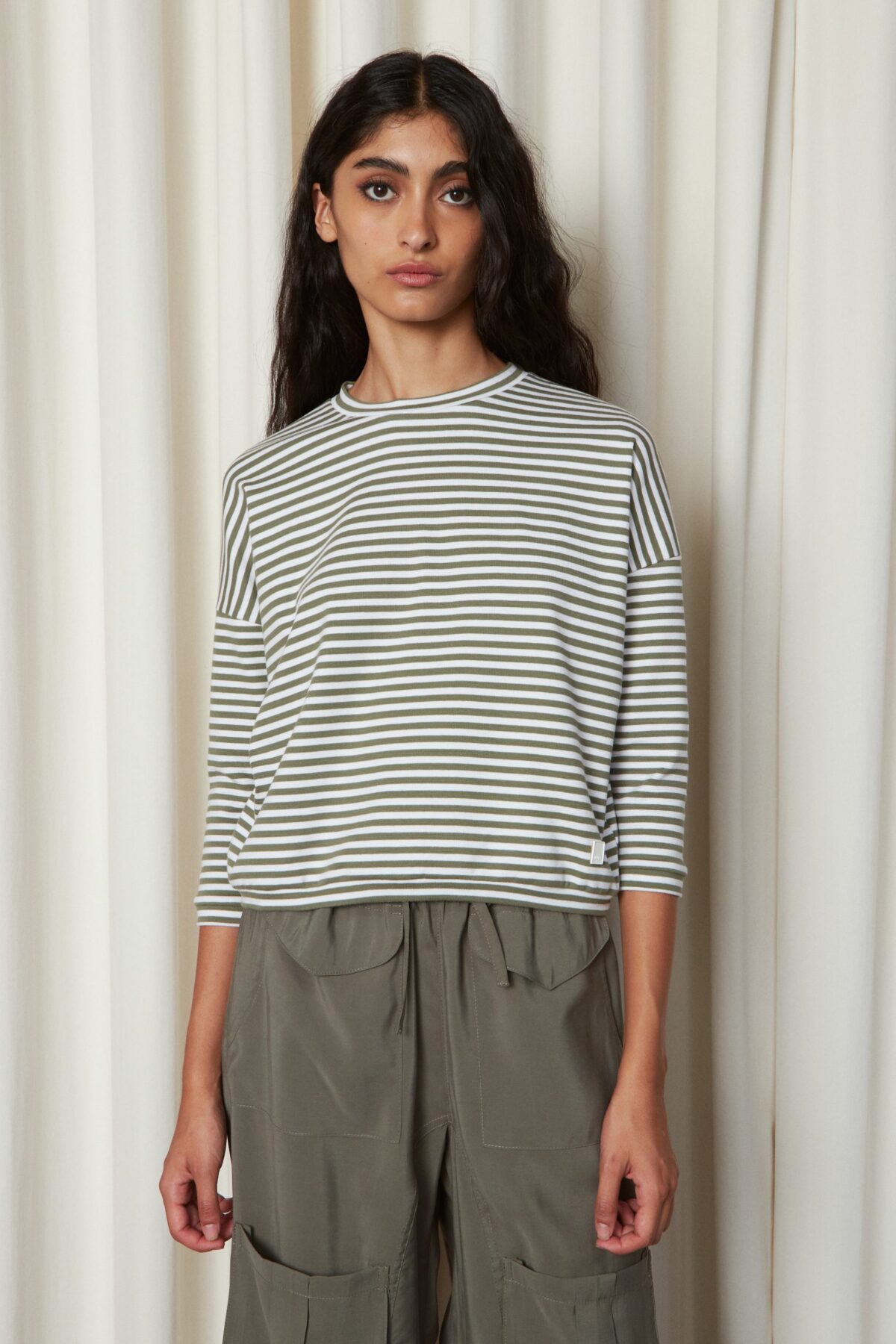 Buzo liviano de jersey pesado rayado. Calce regular, cuello redondo, mangas 3/4. Tu bucito de verano, tu remera de invierno, un clásico de gusmán en versión rayas ✨.
